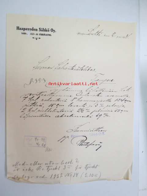Haapaveden Sähkö Oy, Haapavesi, 2.4.1924 - Suomen Sahanterätehdas Oy, Tampere -asiakirja -business document