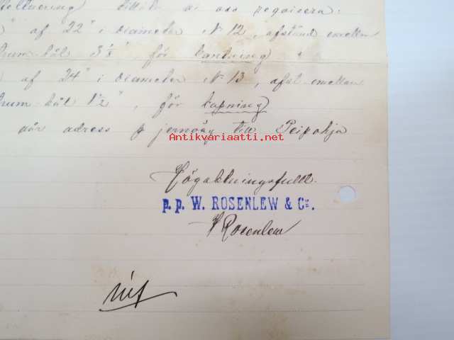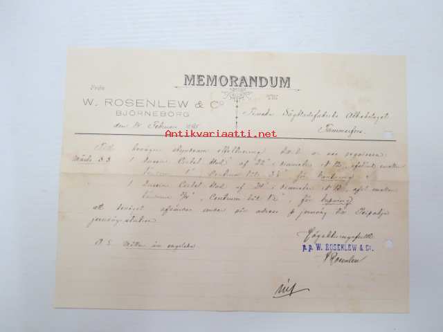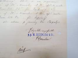 W.Rosenlew & Co Ab, Björneborg, 14.2.1895 - Suomen Sahanterätehdas Oy, Tampere -asiakirja, allekirjoitus W. Rosenlew -business document