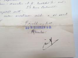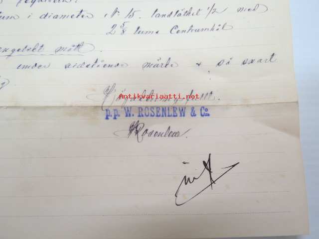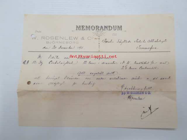 W.Rosenlew & Co Ab, Björneborg, 20.12.1895 - Suomen Sahanterätehdas Oy, Tampere -asiakirja, allekirjoitus W. Rosenlew -business document