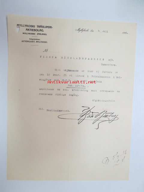 Myllykoski Träsliperi Aktiebolag, Myllykoski, 4.7.1916 - Suomen Sahanterätehdas Oy, Tampere -asiakirja, allekirjoitus B. Björnberg -business document