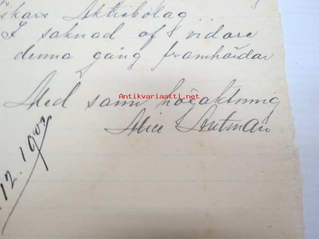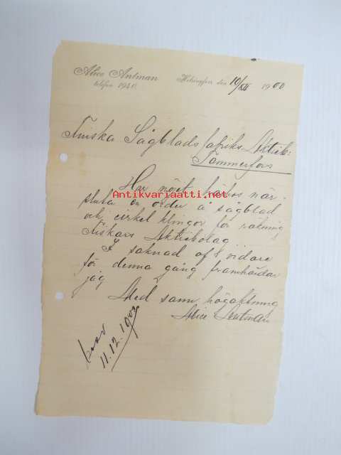 Alice Antman, Helsingfors, 10.12.1900 - Suomen Sahanterätehdas Oy / Finska Sågblads Aktiebolag, Tampere -asiakirja, allekirjoitus Alice Antman -business document