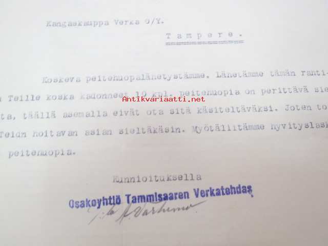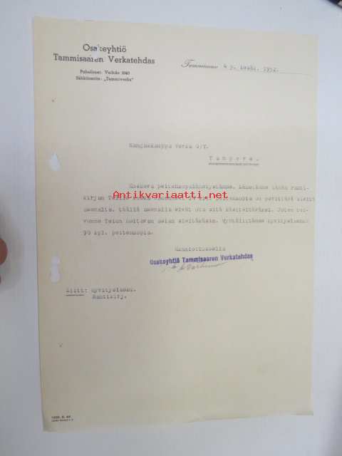 Osakeyhtiö Tammisaaren Verkatehdas, Tammisaari, 4.6.1952 - Suomen Sahanterätehdas Oy / Finska Sågblads Aktiebolag, Tampere -asiakirja -business document