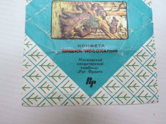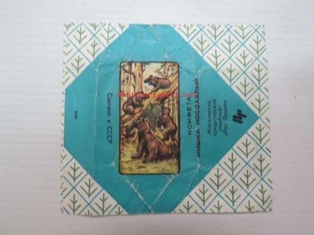 Neuvostoliittolainen "Konfeta Miska Kosolapii" - Moskovskij Konditerkii Kombinat "Rot Front" -makeiskääre (Karhu-aihe) / soviet candy wrap