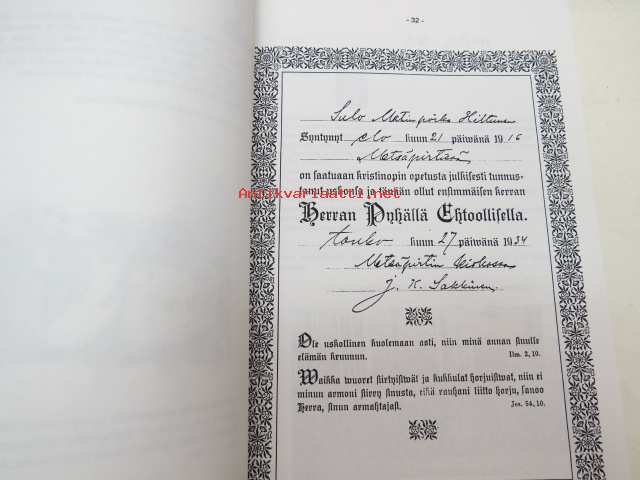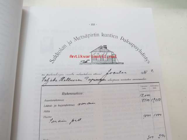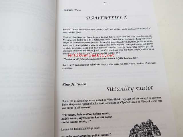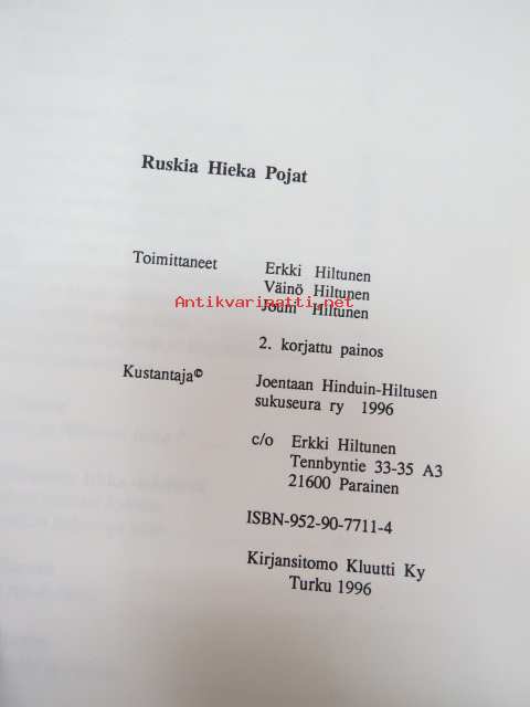 | Saatavilla | 1 kpl | | Julkaisuvuosi | 1996 | | Painos | 1. | | Kunto | K3 | | Sidonta/painoasu | Sidottu (kovak.) | | ISBN | 952-90-7711-4 | | Kielet | Suomi |
