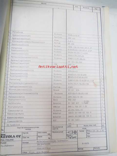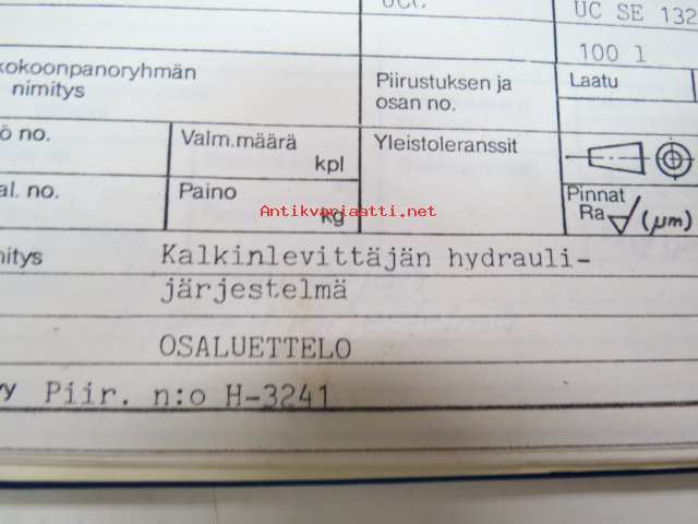 Kone Ketola Oy kalkinlevittäjän hydrauliikan kaavioita - piirustuksia - osaluetteloita yms. -kansio -spreader parts and drawings etc. catalog