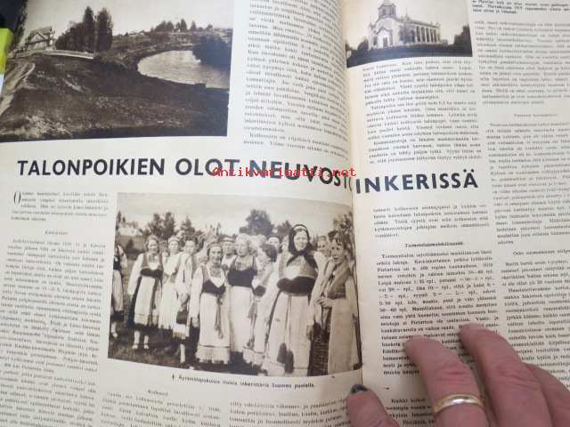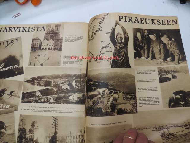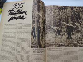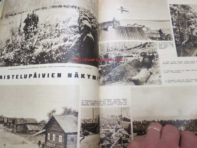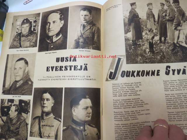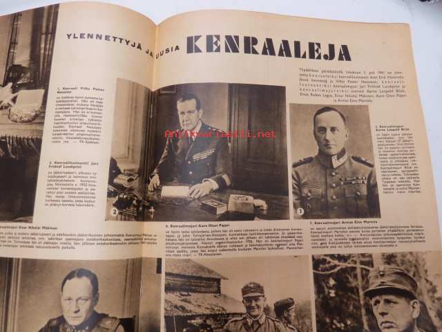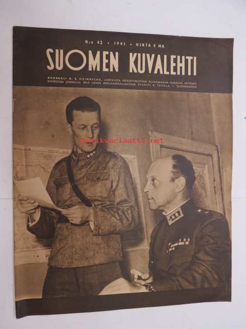 Suomen Kuvalehti 1941 nr 42, sis. mm. seur. artikkelit / kuvat / mainokset; Kansikuva Kenraali A.E. Heinrichs ja Eversti K. Tapola, Maila Talvio 70-vuotias, 105 taistelun päivää, Sata onnistunuttta tiedustelulentoa - vänrikki Kahla, Taistelupäivien näkymiä, Talonpoikien olot Neuvostoinkerissä, Ylennettyjä ja uusia kenraaleita, Uusia everstejä, Joukkomme Syvärillä, Aunukselaisia tupia, Narvikista Piraeukseen, Vuoksen yli, ym. -weekly magazine25 x 31 cm.