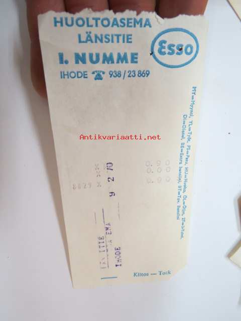Esso Huoltoasema Länsitie I. Numme, Ihode, huoltoasemakuitti 9.2.1970 -receipt