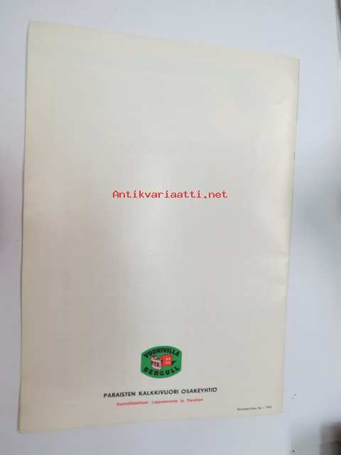 | Saatavilla | 1 kpl | | Julkaisuvuosi | 1965 | | Sivuja | 12 | | Kunto | K3 | | Sidonta/painoasu | Nidottu (pehmeäk.) | | Kielet | Suomi |