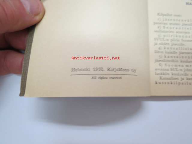 | Saatavilla | 1 kpl | | Julkaisuvuosi | 1953 | | Sivuja | 104 | | Kunto | K3 | | Sidonta/painoasu | Nidottu (pehmeäk.) | | Kielet | Suomi |
