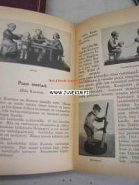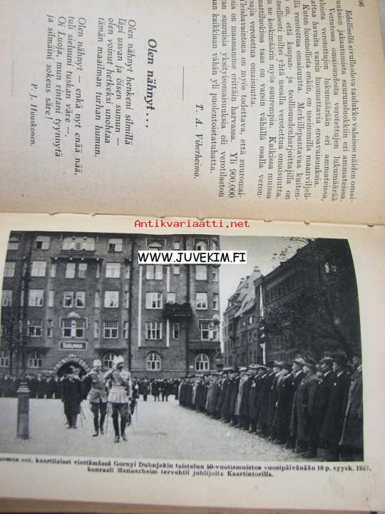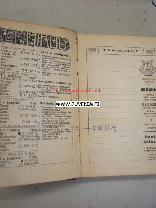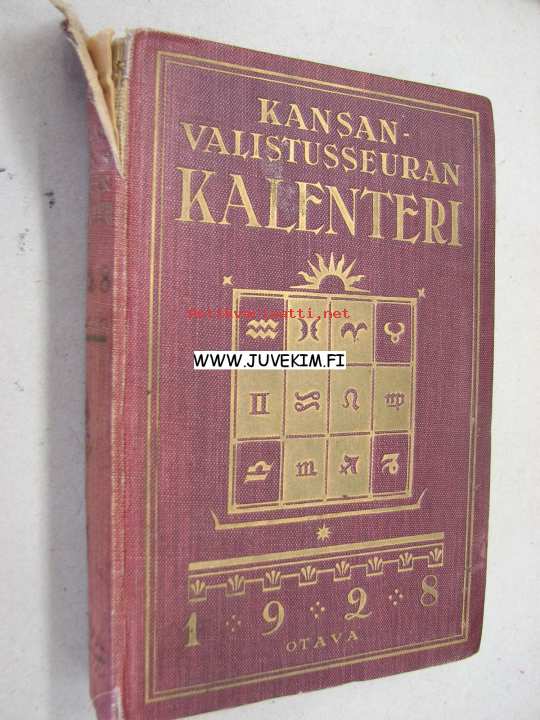 Kansanvalistusseuran Kalenteri 1928, sis. runsaasti mainoksia, artikkeleita, tilastotietoa, rautateitten ja postin kulku, virkamiehistö, puolueet, muistokirjoituksia jne., Yliopiston siirtäminen Helsinkiin v. 1828 ja sen jälkeinen kehitys, Suomen naiset täysivaltaisina kansalaisina, J. Liro - Perunasyöpä, E.E. Kaila - Lentokone rauhassa ja sodassa, Niilo Mustala - Valtakamppailusta Kiinassa, Arvid - Lydecken - Albin Kaasinen - Puun mestari, Varallisuuden jakautumisesta Suomessa, täydellinen sisällysluettelo näkyy kuvissa -calendar with articles12 x 17 cm.