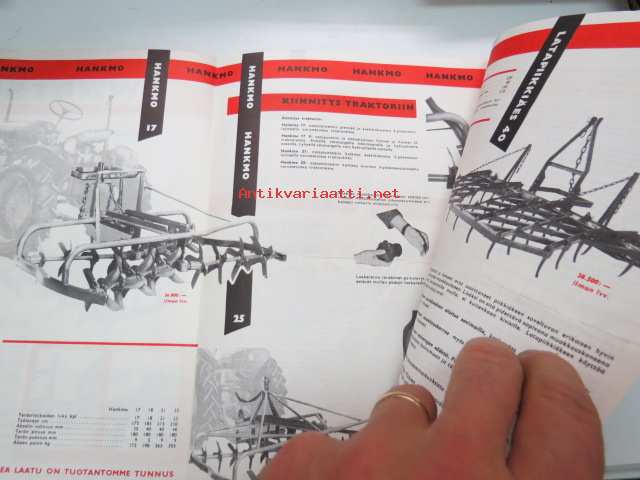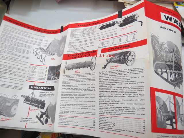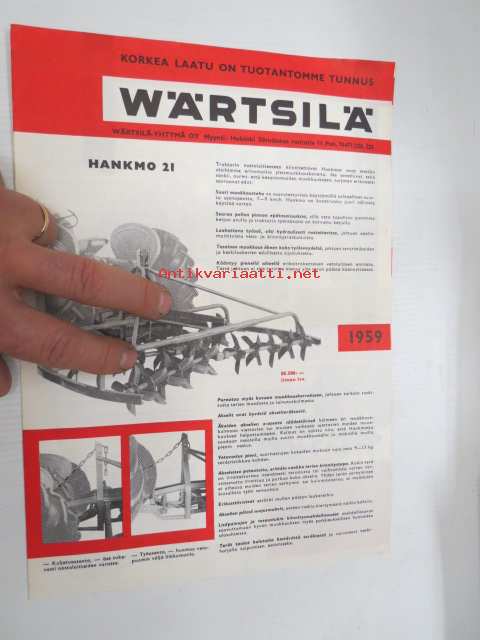 Wärtsilä-Yhtymä Oy Pietarsaaren konepaja, 1959Wärtsilä Hankmo 21, 18, 17, Latapiikkiäes 40, Universal silmukkakultivaattori, Lisälaitteita - maansiirtolevy - vakoaurat - talikko, Kamrikkijyrät, Väkilannoitteiden levityskone, Kylvökone 1959 tuotekuvasto -catalog of Wärtsilä farm machines