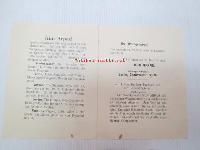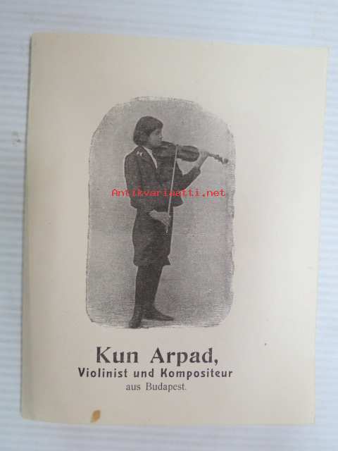 Kun Arpad, Violinist und Kompositeur aus Budapest -myöhemmiltä vaiheiltaan (aikuisiässä) mystisen kohtalon viulistin esiintymismainos -brochure of violinist