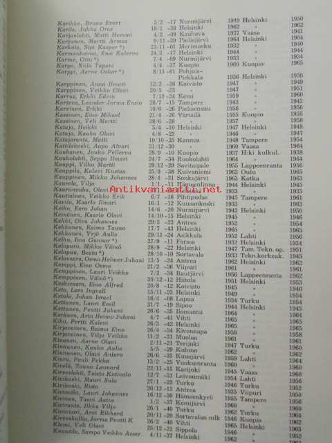 | Saatavilla | 1 kpl | | Julkaisuvuosi | 1966 | | Sivuja | 165 | | Kunto | K2 | | Sidonta/painoasu | Sidottu (kovak.) | | Kielet | Suomi |