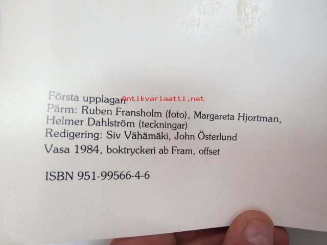 | Saatavilla | 1 kpl | | Julkaisuvuosi | 1984 | | Sivuja | 123 | | Painos | 1. | | Kunto | K3 | | Sidonta/painoasu | Nidottu (pehmeäk.) | | ISBN | 951-99566-4-6 | | Kielet | Ruotsi |