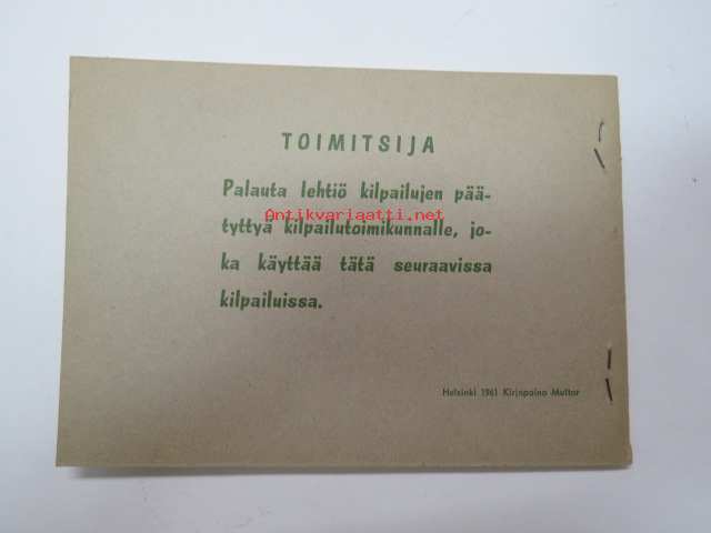 | Saatavilla | 2 kpl | | Julkaisuvuosi | 1961 | | Kunto | K3 | | Sidonta/painoasu | Nidottu (pehmeäk.) | | Kielet | Suomi |
