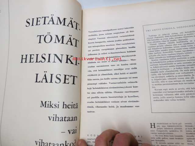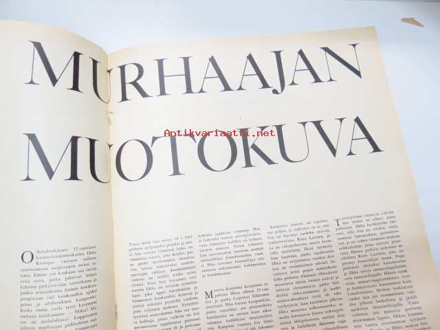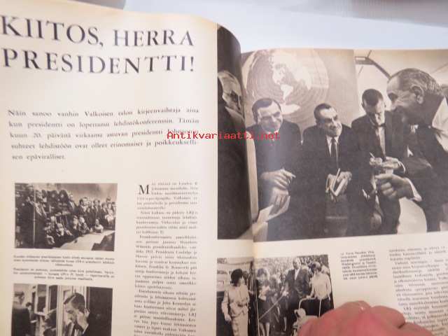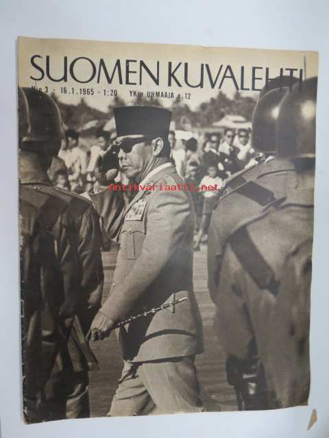 Suomen Kuvalehti 1965 nr 3, ilmestynyt 36.1.1965, sis. mm. seur. artikkelit / kuvat / mainokset; Kansikuva Sukarno, Kent savukkeet, Sietämättömät helsinkiläiset - Miksi heitä vihataan - vai vihataanko?, Pyhäselän kunnallisvaalit nurin - Tyyne Maria Kasurinen, Uransa huipulla - Kari Suomalainen, Murhaajan muotokuva - kuopiolainen kahden naisen murhaaja 17-vuotias Ilkka Kivioja, Fiat 1500, ym. -weekly magazine24 x 31 cm.