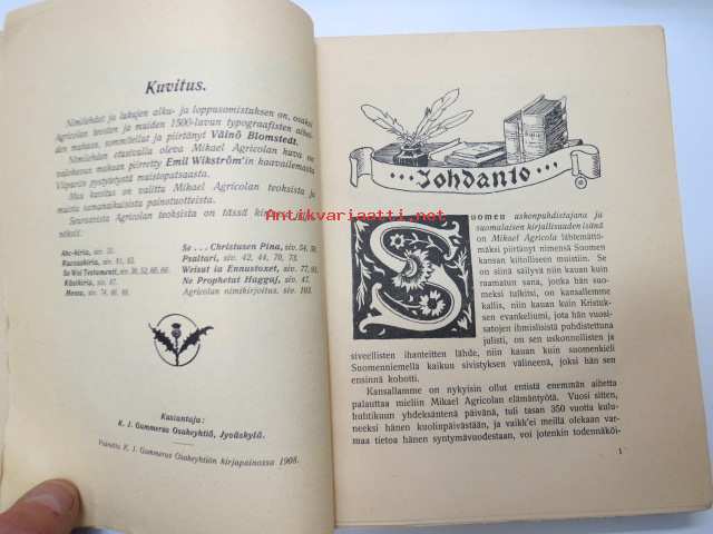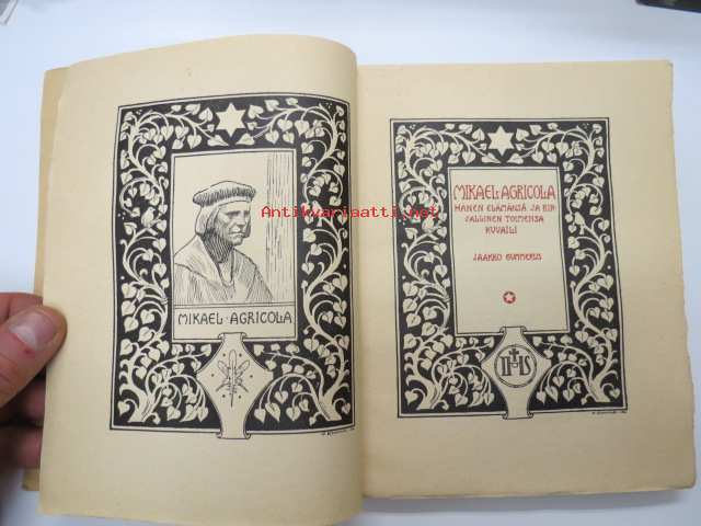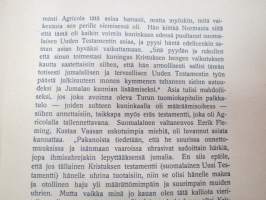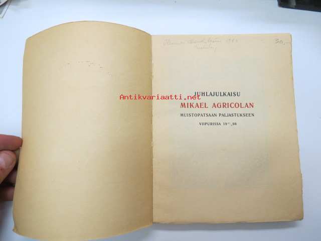 Mikael Agricola - Elämäkerrallinen kuvaus, juhlajulökaisumuistopatsaan paljastukseen Viipurissa 21.6.1908 -life of M. Agricola, kuvitus Väinö Blomstedt
