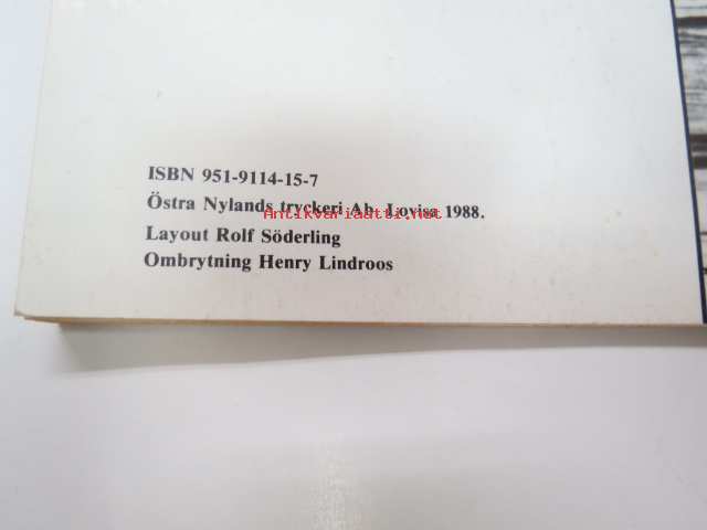 | Saatavilla | 1 kpl | | Julkaisuvuosi | 1988 | | Sivuja | 80 | | Painos | 1. | | Kunto | K3 | | Sidonta/painoasu | Nidottu (pehmeäk.) | | ISBN | 951-9114-15-7 | | Kielet | Ruotsi |