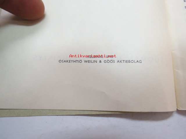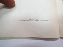 | Saatavilla | 1 kpl | | Julkaisuvuosi | 1943 | | Sivuja | 36 | | Painos | 1. | | Kunto | K2 | | Sidonta/painoasu | Nidottu (pehmeäk.) | | Kielet | Suomi |