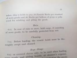 Customs of the ports - for loading of woodgoods - in Finland -Suomen satamissa noudatettavat, satamittain ja lastausalueittain vaihtelevat tavat, taksat, ilmoittautumisajat yms. informaatio jota laivojen päällystö, rahtaajat ja varustamojen edustajat tarvitsivat