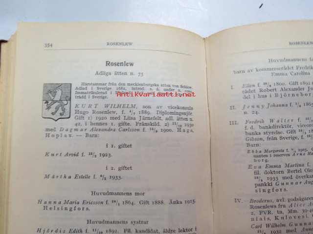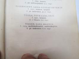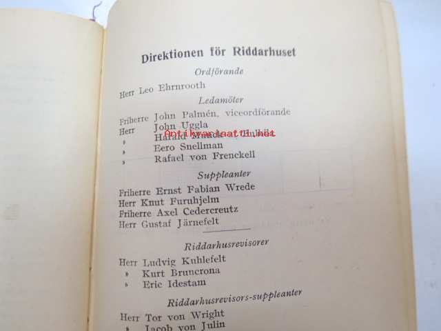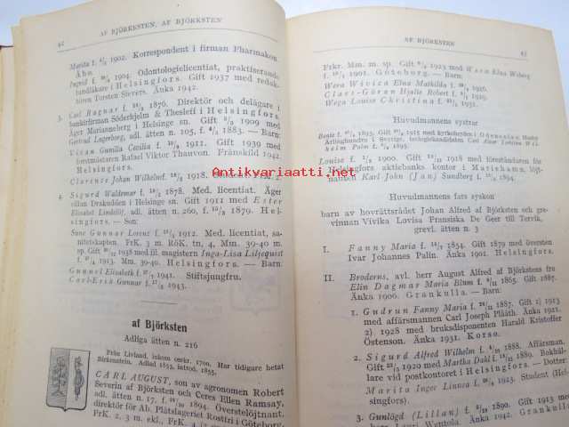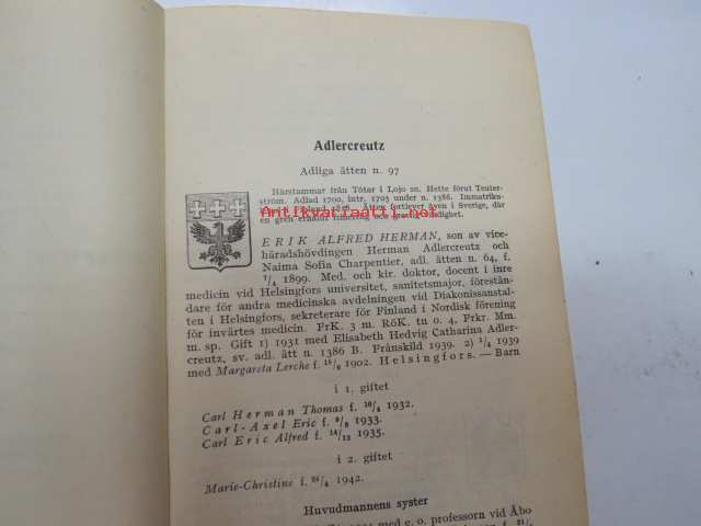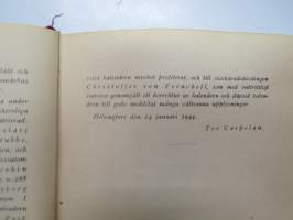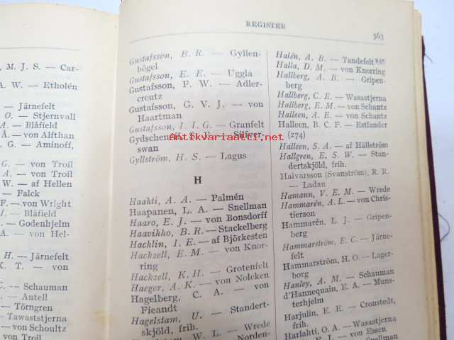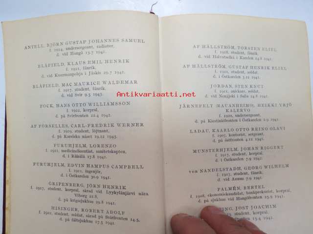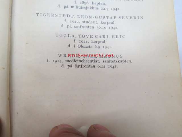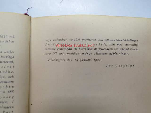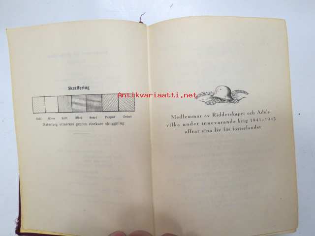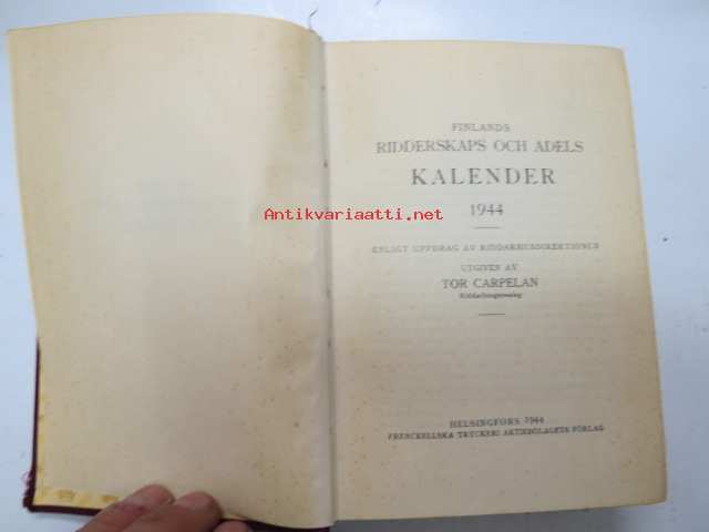 Finlands adelskalender - Finlands ridderskaps och adels kalender 1944 -aateliskalenteri, sisältää erillisen luettelon sodan 1939-40 isänmaalle henkensä uhranneista aatelisista - "Medlemmar av Ridderskap och Aldeln vilka under innevarande krig 1941-1943 offrat sina liv för fosterlandet" -calendar of finnish nobility, contains special listing of persons belonging to nobility who have sacrificed their lives for their nation during the ongoing war