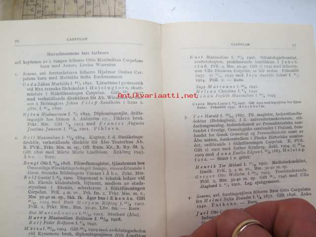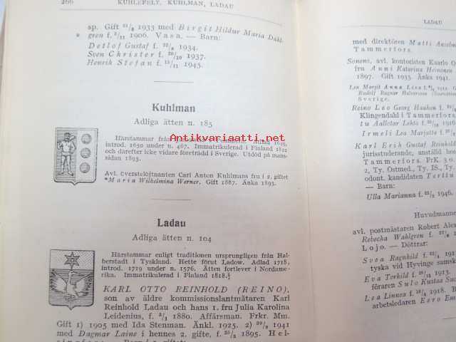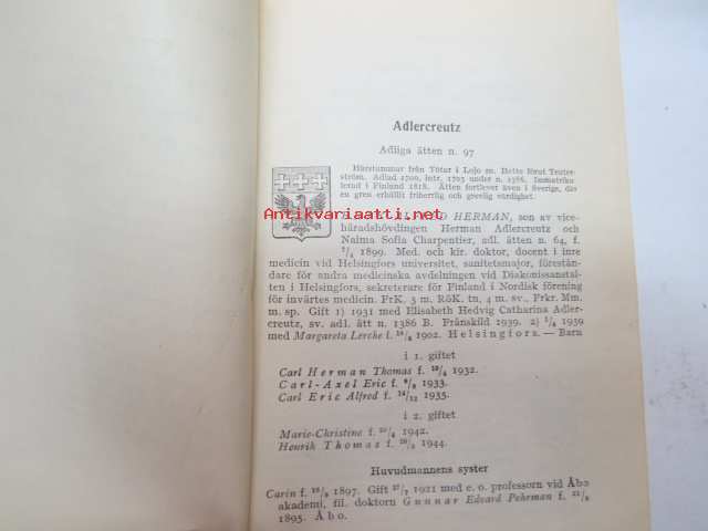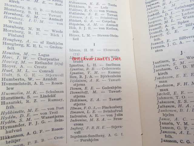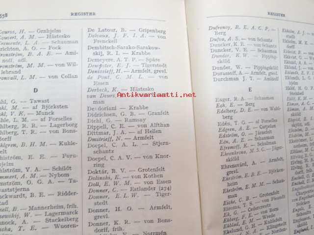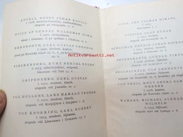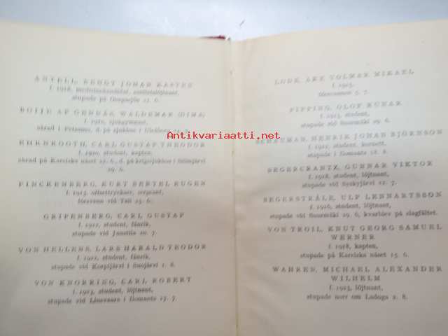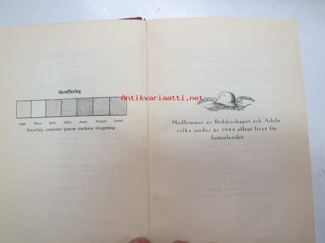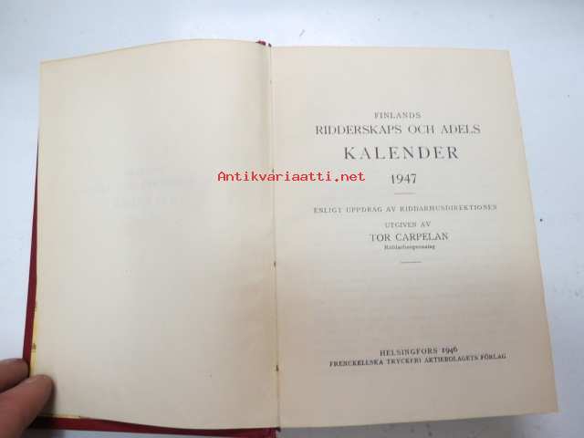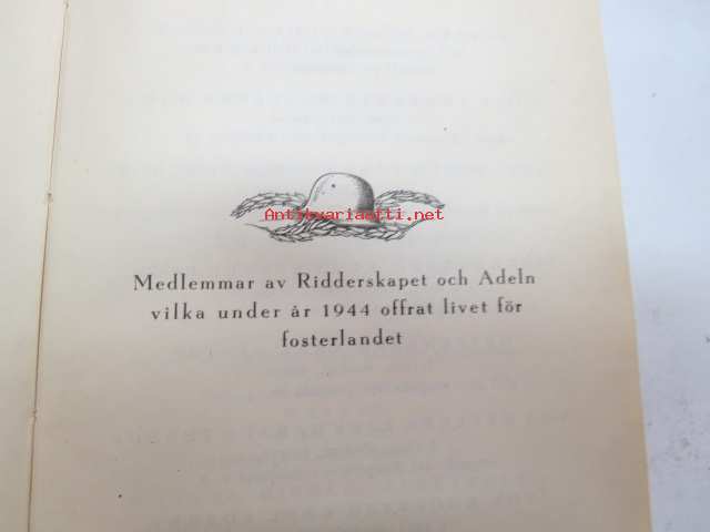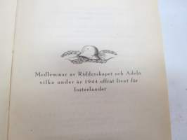 Finlands adelskalender - Finlands ridderskaps och adels kalender 1947 -aateliskalenteri, sisältää erillisen luettelon sotavuoden 1944 aikana isänmaalle henkensä uhranneista aatelisista - "Medlemmar av Ridderskap och Aldeln vilka under år 1944 offrat livet för fosterlandet" -calendar of finnish nobility, contains special listing of persons belonging to nobility who have sacrificed their lives for their nation during the war year 1944