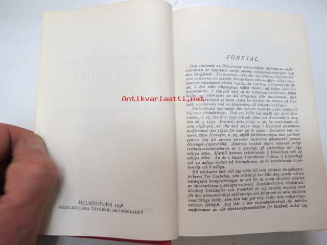 | Saatavilla | 1 kpl | | Julkaisuvuosi | 1958 | | Sivuja | 625 | | Painos | 1. | | Kunto | K2 | | Sidonta/painoasu | Sidottu (kovak.) | | Kielet | Ruotsi |