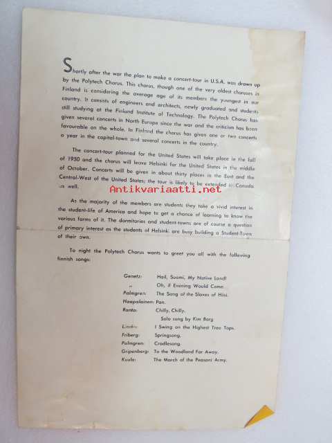 The Polytech Chorus of Finland singing choral music by Sibelius and othe finnish composers - Conductor Ossi Elokas -polyteknikkojen kuoron ulkomaanesiintymisten ilmoituslappuja (New York), joilla esiintymistä mainostettiin -chorus posters17 x 25 cm.