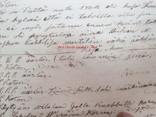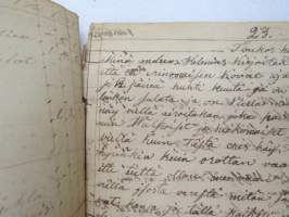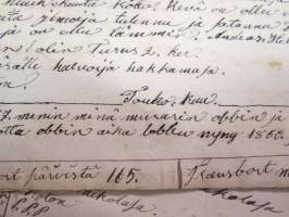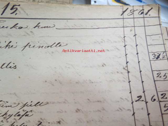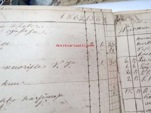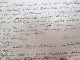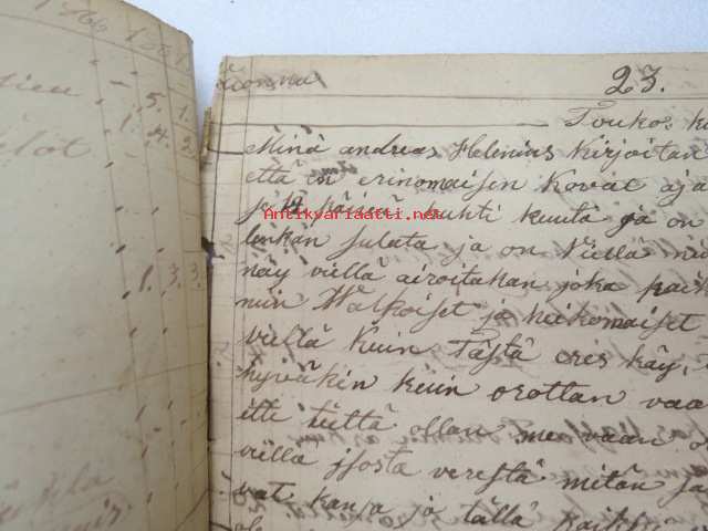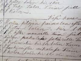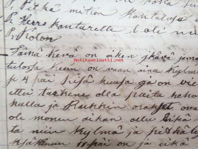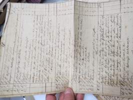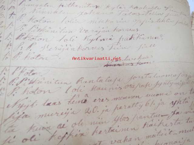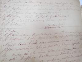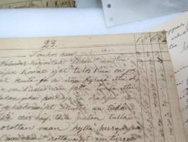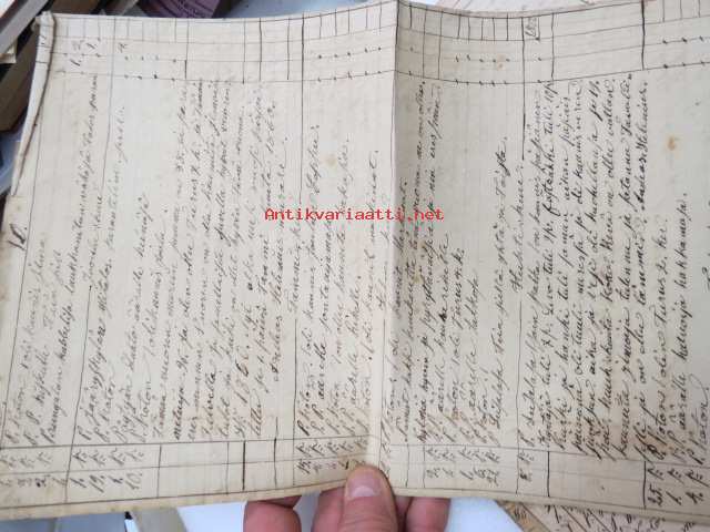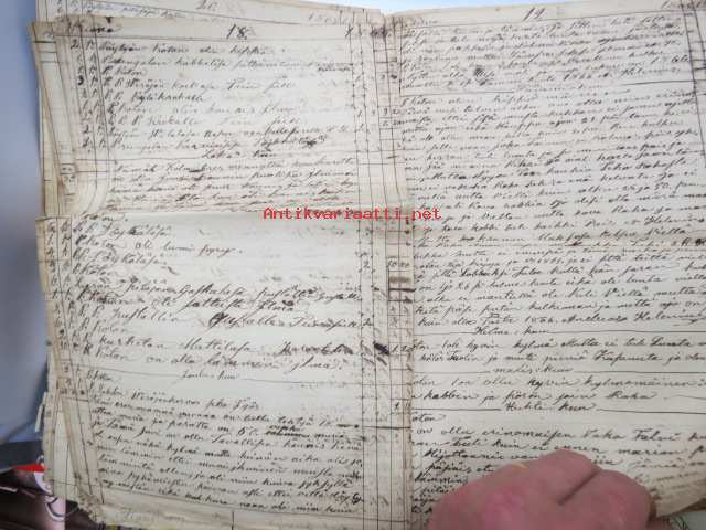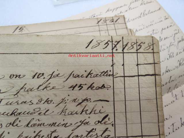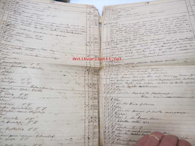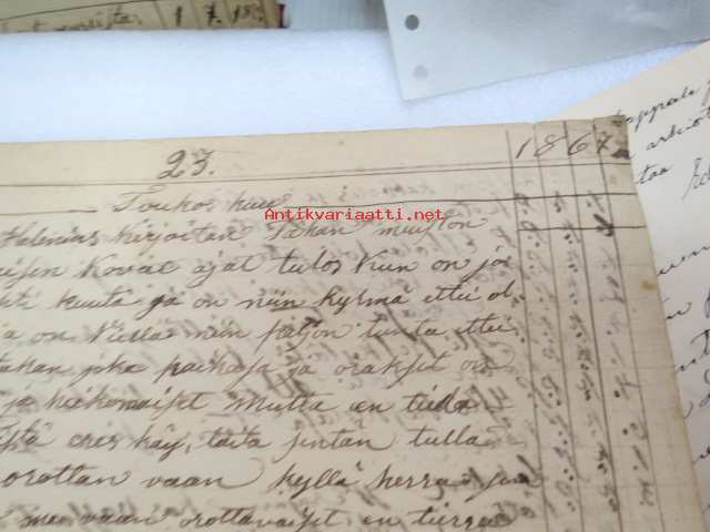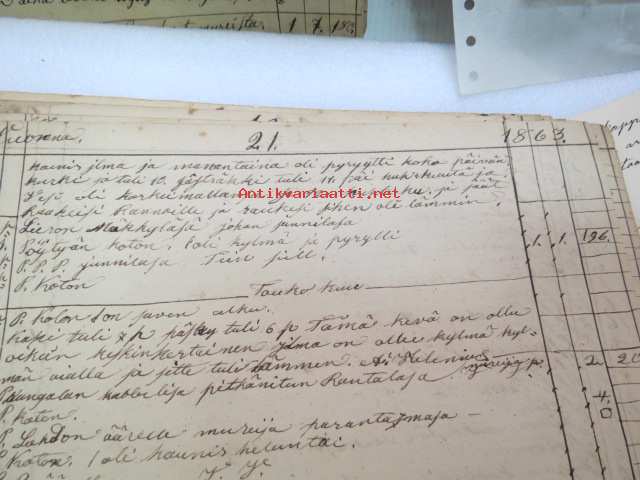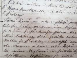 Muurari Anders / Antti Helenius, Pöytyä - Lahto - Ojalan torppa, kuollut 8.6.1893, kansanmiehen pitämät päiväkirjat / muistiinpanot elämästä ja oloista vuosien 1857-1867 väliseltä ajalta. Sivupuutteistaan huolimatta muistiinpanoista ja merkinnöistä saa hyvän käsityksen aikansa ammattimiehen työstä & tuloista, elinolosuhteista, vuodentuloista ja ajan yleisestä ilmapiiristä sekä taloudellisista oloista - myös säätilaa on seurattu. Käynnit lähiseudun tiloilla ja rustholleissa lueteltu tarkkaan tehtyine töineen, sisältää 20 sivua tekstiä sekä perukirjan hänen jälkeensä sekä kuolinpesän huutokauppaluettelon. Kohtalaisen hyvää ja lukukelpoista tekstiä - noina aikoina "sujuva" kirjoitustaito ei ollut suinkaan itsestäänselvyys, päiväkirjan pito todella harvinaista - saati että niitä vähiä olisi säilynyt näistä kansankerroksista nykypäivään. Selkeä ja hyvä tutkimuskohde hyvin identifioitavissa olevasta henkilöstä. -Diary and remarks of an bricklayer / farmer / handyman between years 1857-1867, 20 pages of texts and 2 documents giving good insight to life of a common man (very rare custom to keep diary and a miracle that these have survived to this day)Kohteesta 47 kuvaa / 47 pictures from this item.