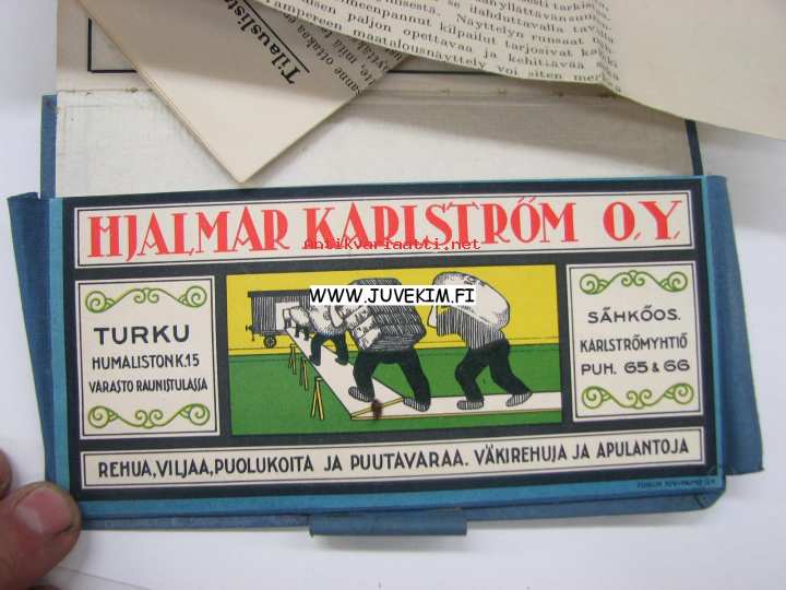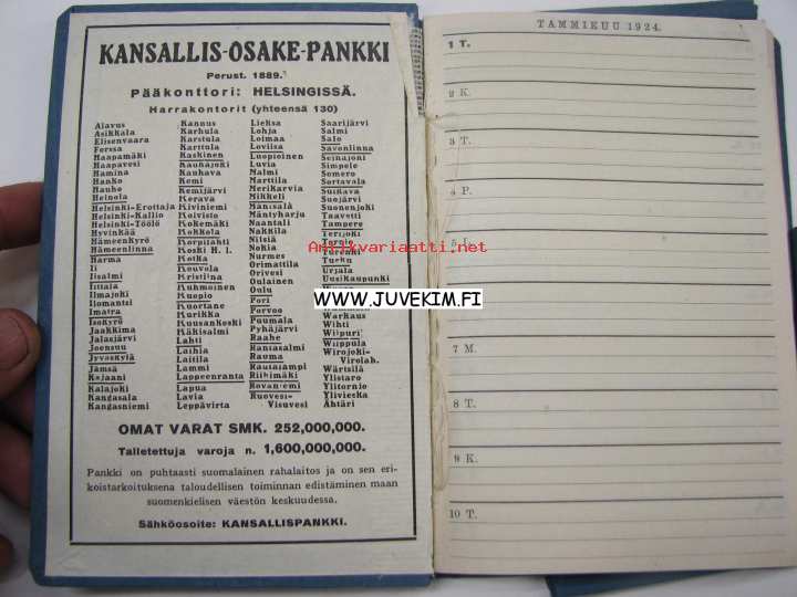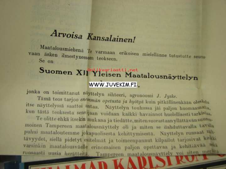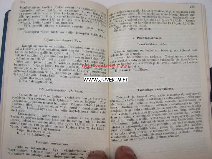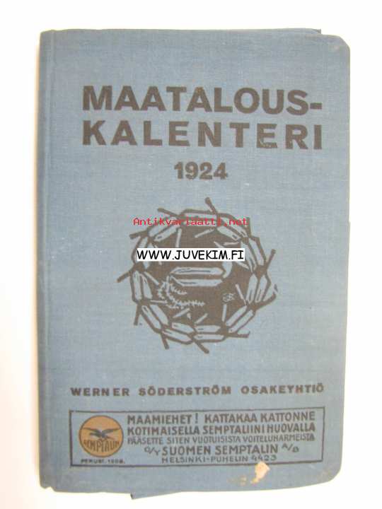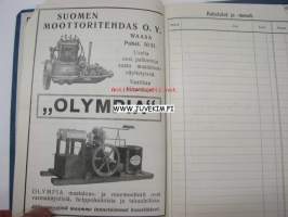 | Saatavilla | 1 kpl | | Julkaisuvuosi | 1923 | | Sivuja | 289 | | Kunto | K2 | | Merkintöjä ja "sotkuja", osa etulehdistä puuttuu | | Sidonta/painoasu | Nidottu (pehmeäk.) | | Kielet | Suomi |