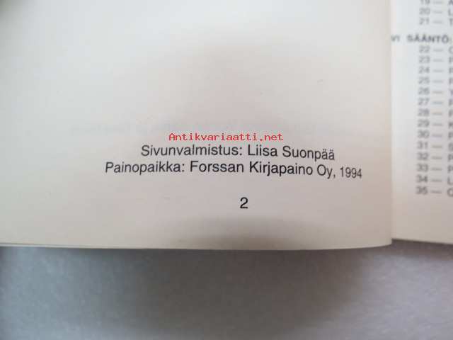 | Saatavilla | 1 kpl | | Julkaisuvuosi | 1994 | | Sivuja | 96 | | Painos | 23. | | Kunto | K3 | | Sidonta/painoasu | Nidottu (pehmeäk.) | | Kielet | Suomi |