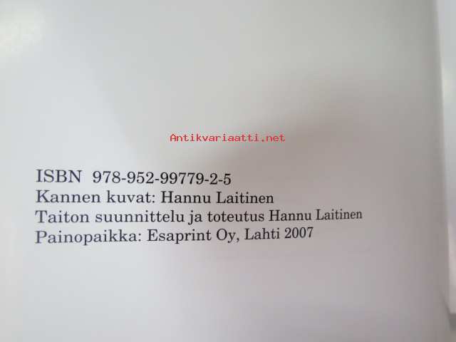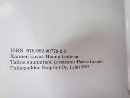 | Saatavilla | 1 kpl | | Julkaisuvuosi | 2007 | | Sivuja | 127 | | Painos | 1. | | Kunto | K4 | | Uusi, käyttämätön kirja | | Sidonta/painoasu | Kuvitettu kovakantinen | | ISBN | 978-952-99779-2-5 | | Kielet | Suomi |