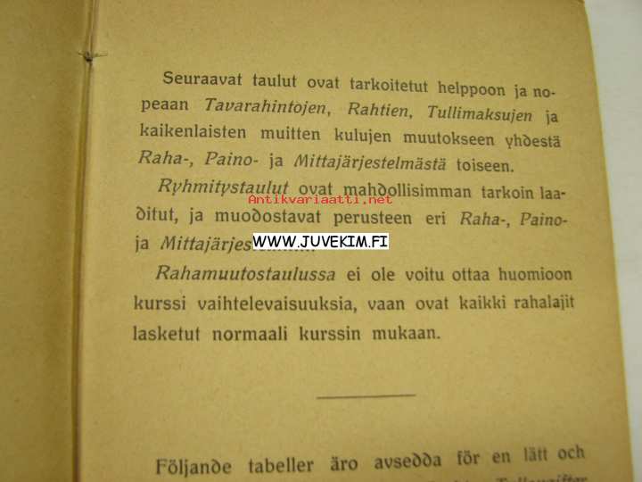| Saatavilla | 1 kpl | | Julkaisuvuosi | 1917 | | Sivuja | 68 | | Painos | 1. | | Kunto | K2 | | Sidos osin irti liimauksesta | | Sidonta/painoasu | Sidottu (kovak.) | | Kielet | Suomi |
