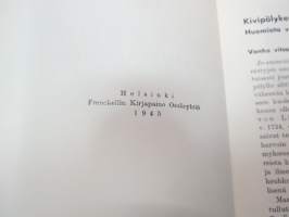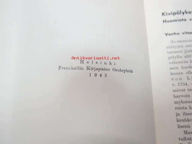 | Saatavilla | 3 kpl | | Julkaisuvuosi | 1945 | | Sivuja | 30 | | Painos | 1. | | Kunto | K3 | | Sidonta/painoasu | Nidottu (pehmeäk.) | | Kielet | Suomi |
