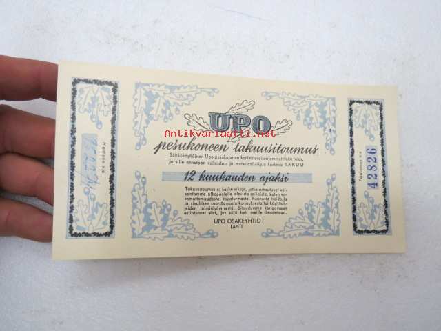 Upo pesukoneen takuusitoumus nr 42826 -kuitti / warranty certificate