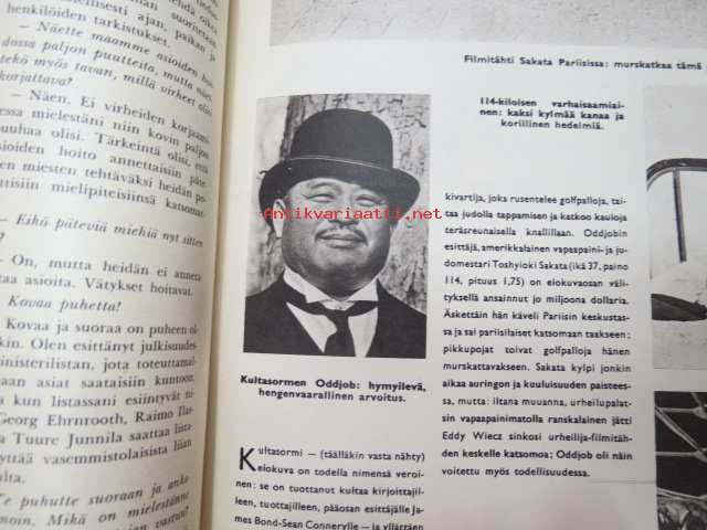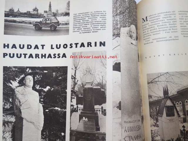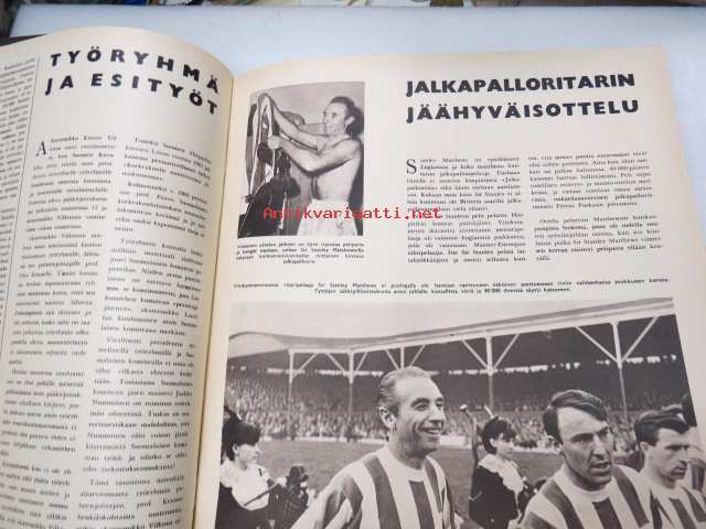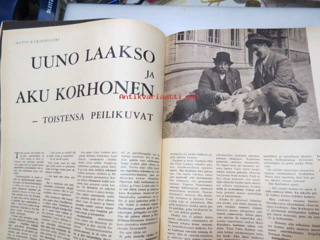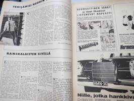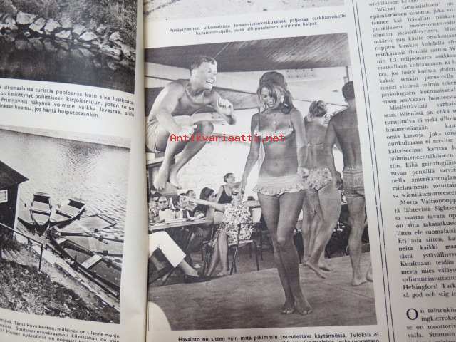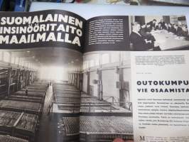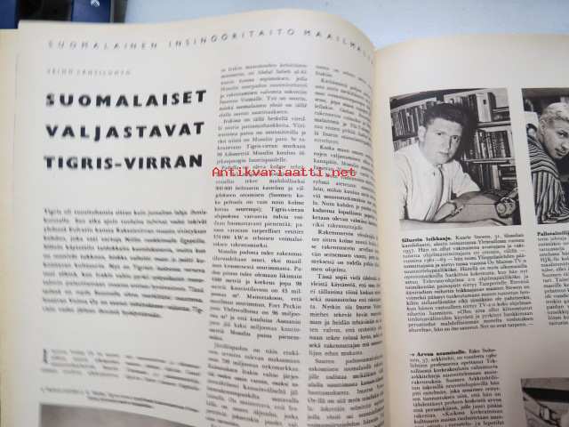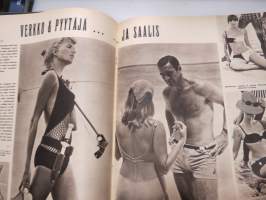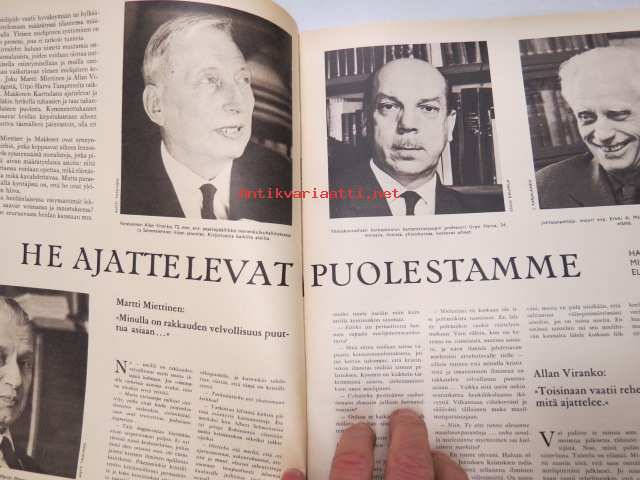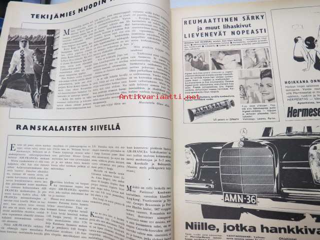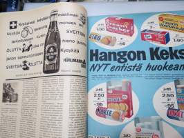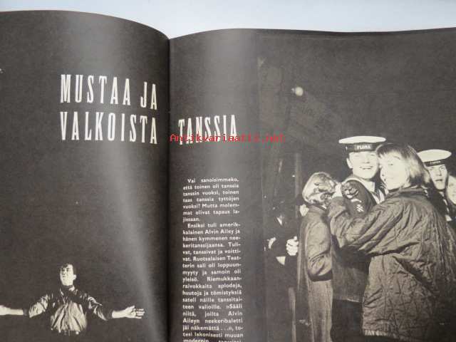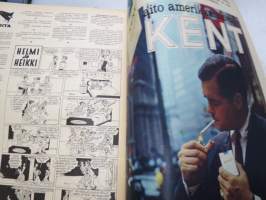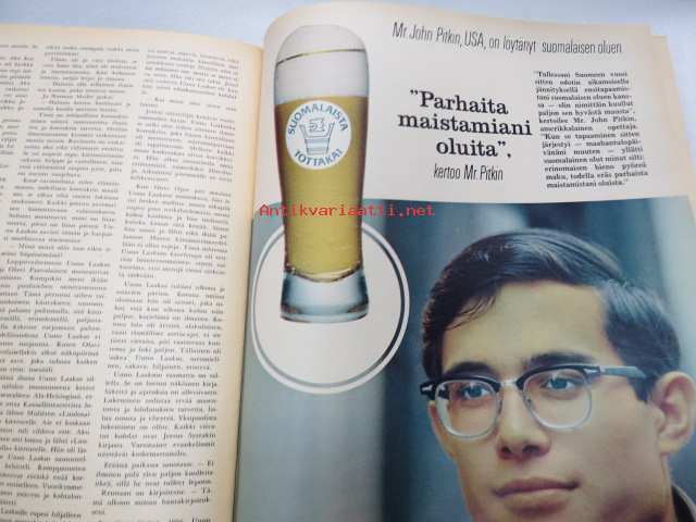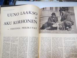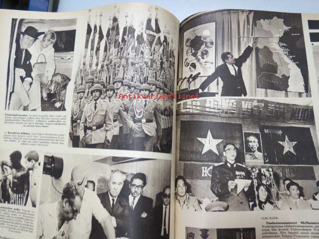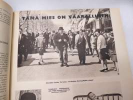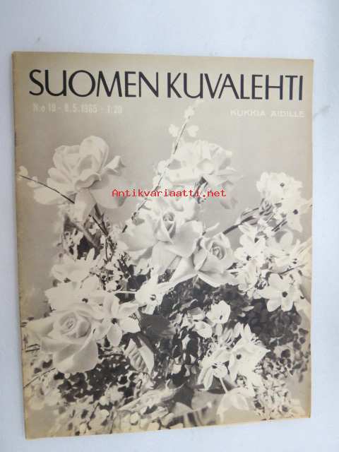 Suomen Kuvalehti 1965 nr 19, ilmestynyt 8.5.1965, sis. mm. seur. artikkelit / kuvat / mainokset; Kansikuva "Kukkia äidille", Hangon keksit, He ajattelevat puolestamme - Allan Viranko - Urpo Harva - Erkki A. Makkonen - Martti Miettinen, Kultasormi-elokuvan Oddjob, Mustaa ja valkoista tanssia - amerikkalainen Alvin Ailey ja 10 neekeritanssijaa vierailulla, Uuno Laakso ja Aku Korhonen - toistensa peilikuvat, Suomalainen insinööritaito maailmalla, Suomalaiset valjastavat Tigris-virran, ym. -weekly magazine. Onnittelukuvissa: Albertiina Piirainen 90v. Anna Kanninen 80v. Urho Muroma 75v. Martti Halmesmaa 60v. Paavo Kämppi 60v. Eino Kajaste 60v. Kuno Alffthan 50v.24 x 31 cm.