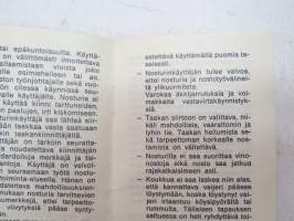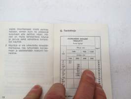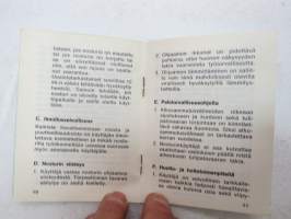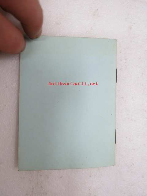 | Saatavilla | 1 kpl | | Julkaisuvuosi | 196? | | Sivuja | 20 | | Kunto | K2 | | Sidonta/painoasu | Nidottu (pehmeäk.) | | Kielet | Suomi |