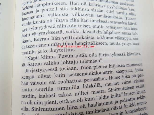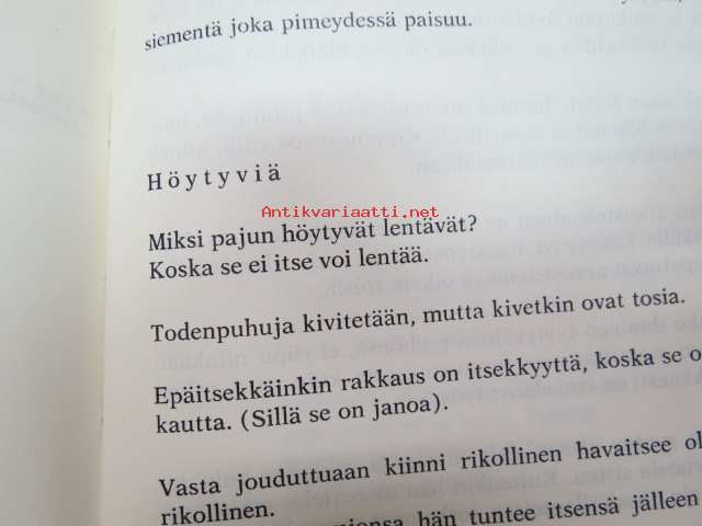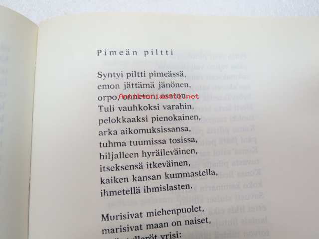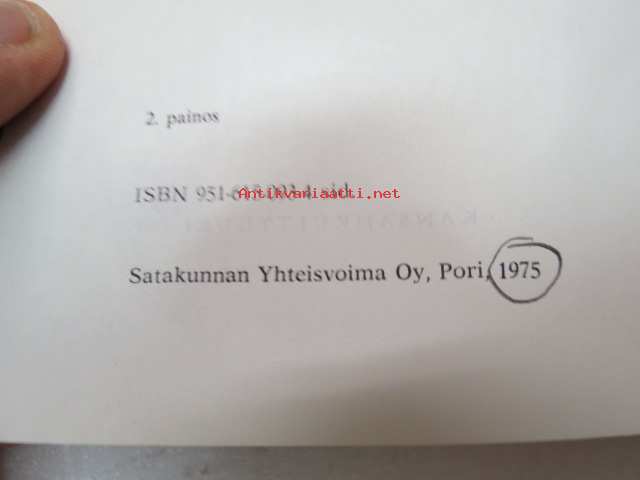 | Saatavilla | 1 kpl | | Julkaisuvuosi | 1975 | | Sivuja | 186 | | Painos | 2. | | Kunto | K3 | | Sidonta/painoasu | Sidottu (kansipaperit) | | ISBN | 951-615-093-4 | | Kielet | Suomi |