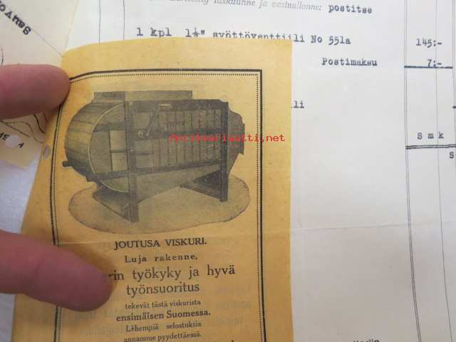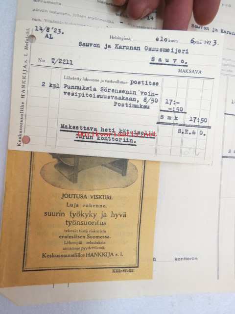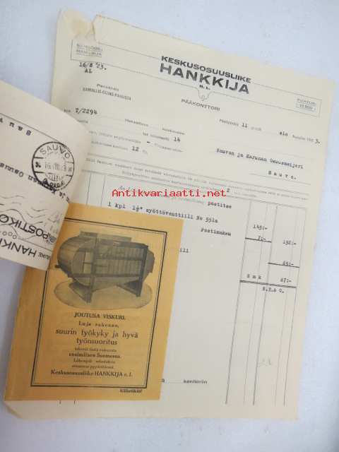 Keskusosuusliike Hankkija, Helsinki 11.8.1923 - Sauvon ja Karunan Osuusmeijeri -asiakirja, mukaan liimattu viskuri Joutusa / viljanlajittelija Triumf esite -business document