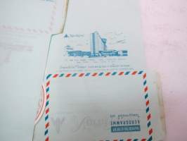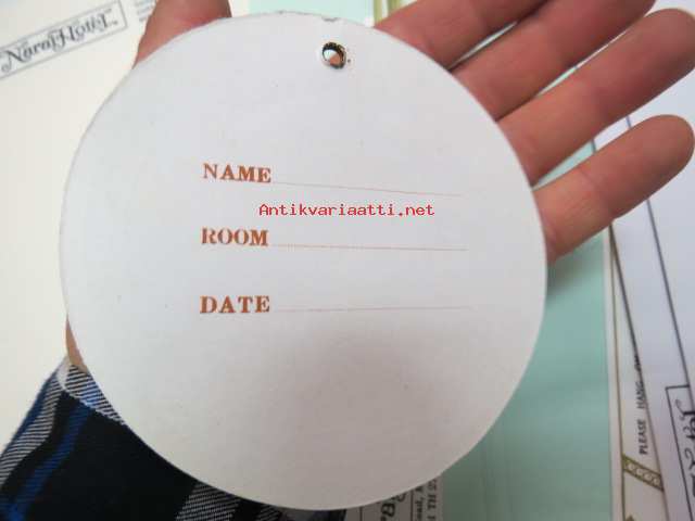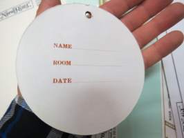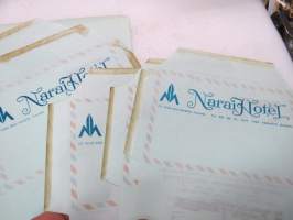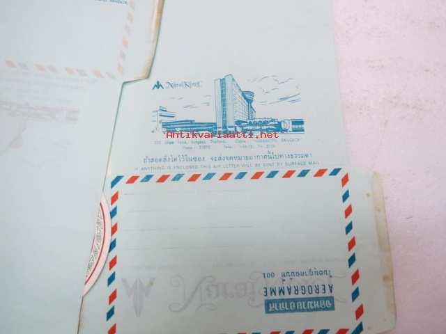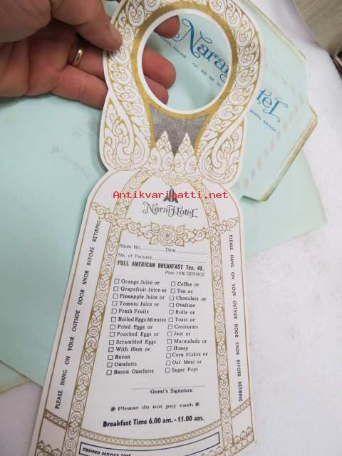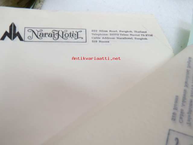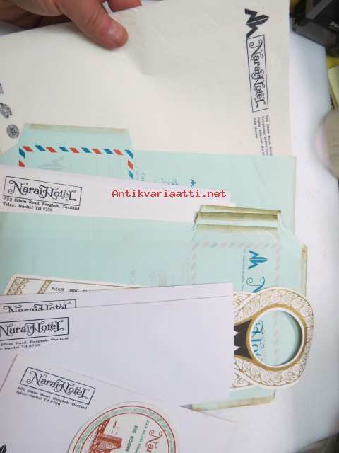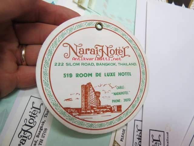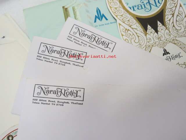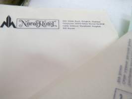 Narai Hotel, 222 Silom Road, Bangkok, Thailand -hotellin huonetarvikkeita 1960-luvulta; kirjeitä, kirjepaperia, aamiaistilaus, osoitelappu - hotel room accessories