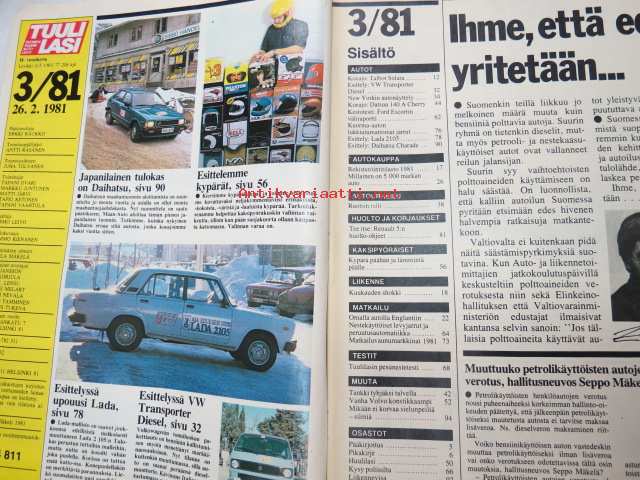 Tuulilasi 1981 nr 3, sisältää mm. seur. artikkelit / kuvat / mainokset; Talbot Solara GLS koeajo, Omalla autolla Englannissa, Millainen on 5 000 markan auto - kierros helsinkiläisissä käytettyjen autojen liikkeissä?, Etuveto valtaa Amerikan, Hannu Mikkola & Audi Quattro, Datsun 140A Cherry GLK, koeajo, Moottoripyöräkypärät esittely, Ford Escort kestotesti 10 000 km väliraportti, Daimler-Benz esitteli kuorma-auton lukkiutumattomat jarrut, Lada 2105 esittely, ym. -motoring magazine21 x 30 cm.