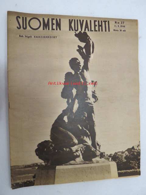 Suomen Kuvalehti 1948 nr 37, ilmestynyt 11.9.1948, sis. mm. seur. artikkelit / kuvat / mainokset; Kansikuva Robert Stigell - Haaksirikkoiset, Fanny-Blankers Koe, F.E. Sillanpää - pienten suuri runoilija, Missä vika? - Miksei raviurheilu kiinnosta kaupunkilaisia?, Kauppakorkeakoulun uuden rakennuksen mallikuva, Karimaa kauppapuutarha - Kokemäki - Matti Viitasaari, ym. -weekly magazine