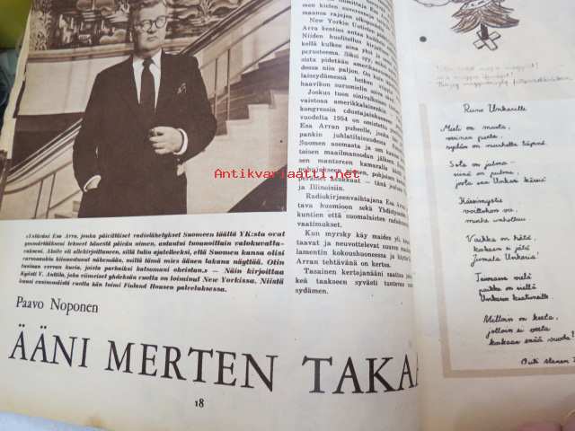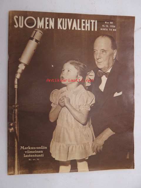 Suomen Kuvalehti 1956 nr 50, ilmestynyt 15.12.1956, sis. mm. seur. artikkelit / kuvat / mainokset; Kansikuva Markus-sedän (Markus Rautio) viimeinen lastentunti + artikkeli, Sahan pilli ei soi - pääkirjoitus - käsittelee pienten sahojen vaikeaa tilannetta, Totuus sädevaarasta, Intsenäisyyspäivä - Linnan kutsut, Paavo Noponen - ääni merten takaa, Paavo Koli - Aivopesu - totalitaaristen valtioiden salainen ase, Lähtö Sueziin - Suomen YK-komppania on lähtenyt,Snellmanin kuolintalo puretaan - Danskarby - Porkkala, Spandaun 4 viimeistä Albert Speer - Walter Funk - Rudolf Hess - Baldur von Schirach, ym. -weekly magazine