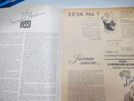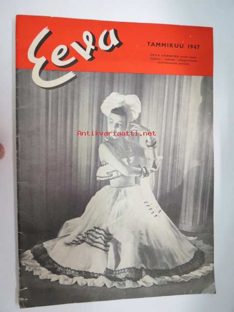 Eeva 1947 nr 1 tammikuu, sis. mm. seur. artikkelit / kuvat / mainokset; Kansikuva Eeva Hemming tanssii sambaa, Amerikan lehdistöattashea Henry Arnold, Arkkitehti Kyllikki Halne - Kestikartanon luoja (Alvar Aalto ym. huonekaluja), G.B. Shaw ja kamera,Tommy Rogers ja Hylde Lamonte opettavat suomalaisia tanssimaan, Mitä ei saa tehdä kun on naimaton, keski-ikäinen ja opettajatar, Itsenäisyyspäivää juhlittiin taas, Suomen itsenäisyyspäivän juhla Moskovassa, Suomalainen Sally Sorvo tanssii Broadwaylla, ym. -women´s magazine
