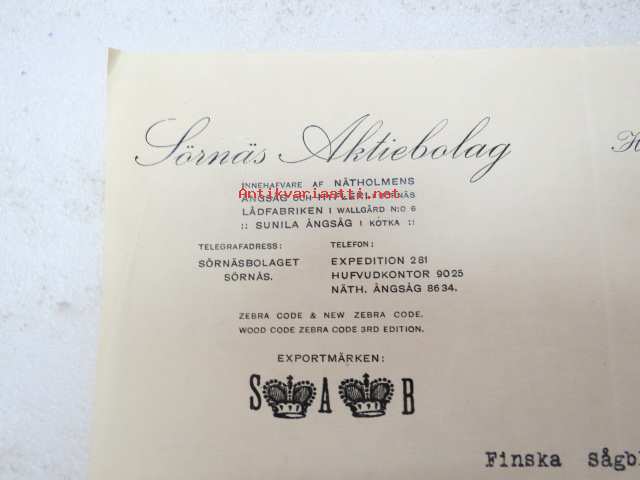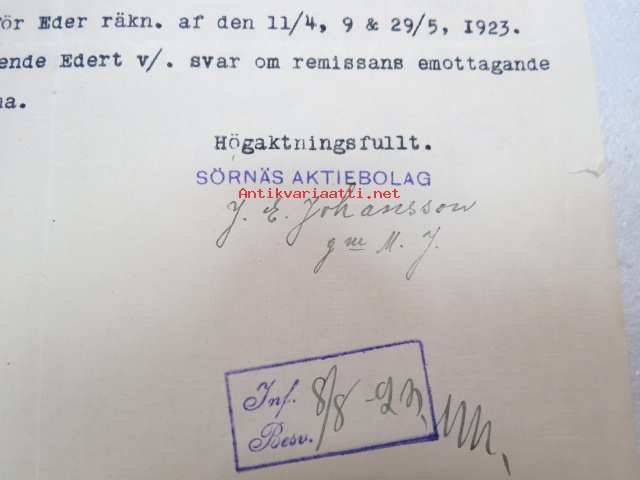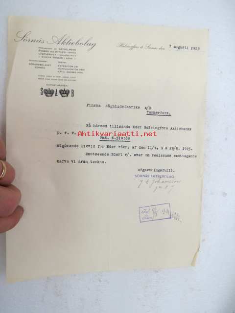 Sörnäs Aktiebolag, Helsingfors & Sörnäs den 7.8.1923 -asiakirja / business document