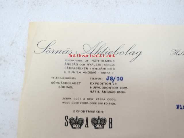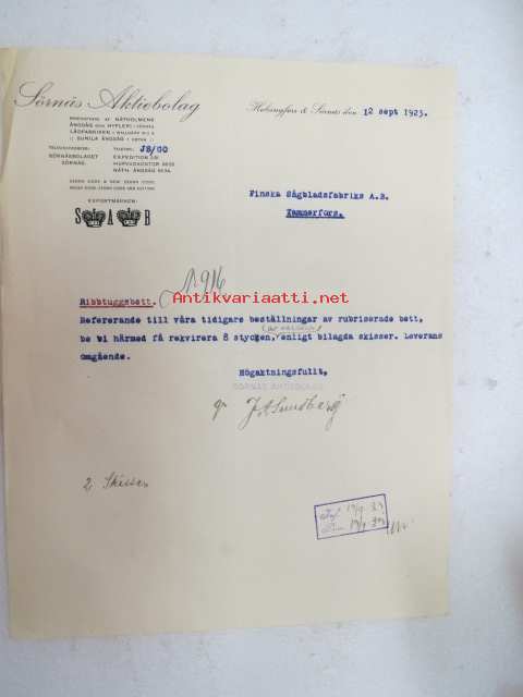 Sörnäs Aktiebolag, Helsingfors & Sörnäs den 12.9.1923 -asiakirja / business document