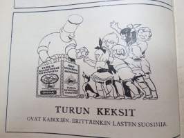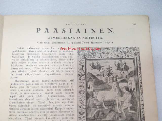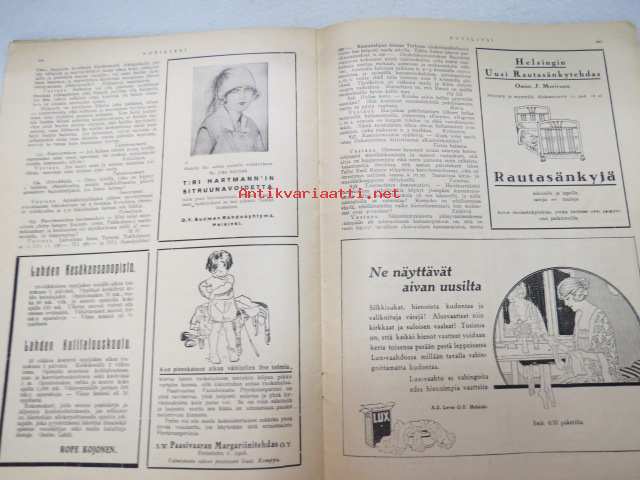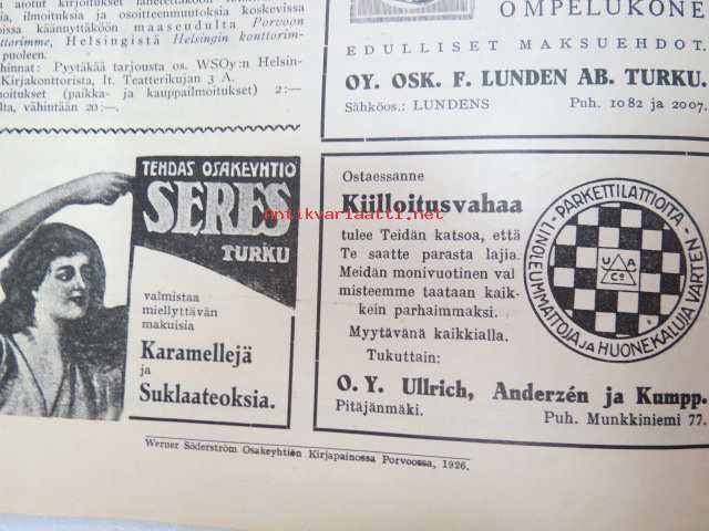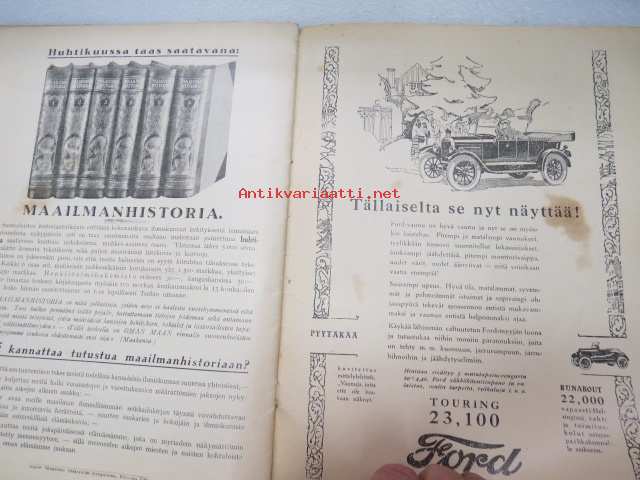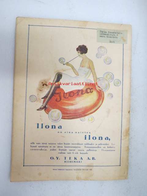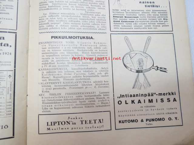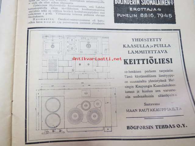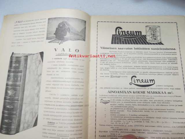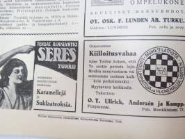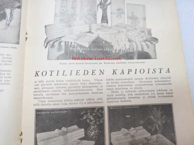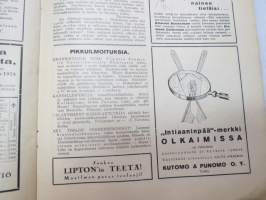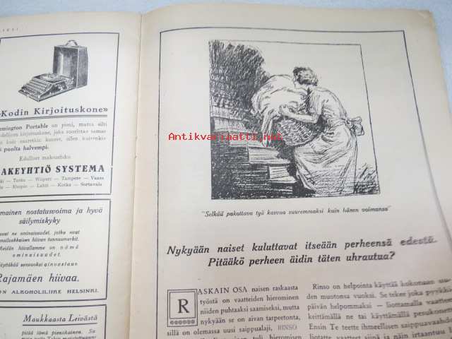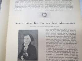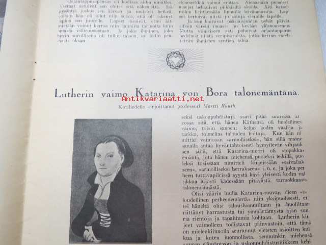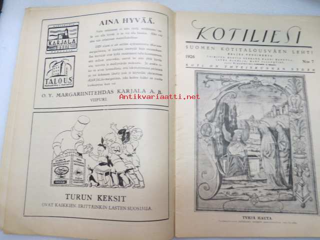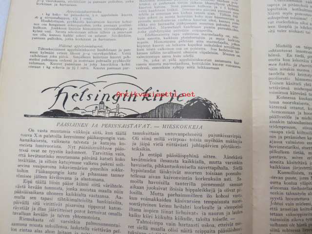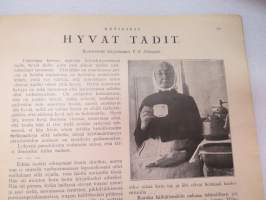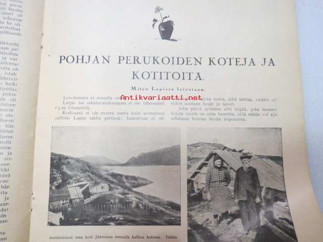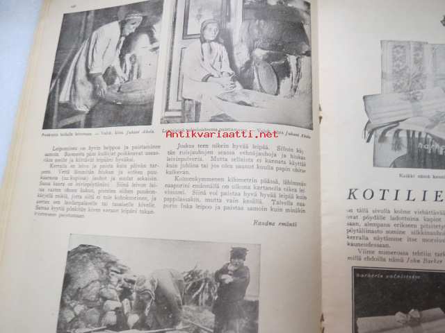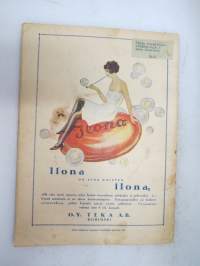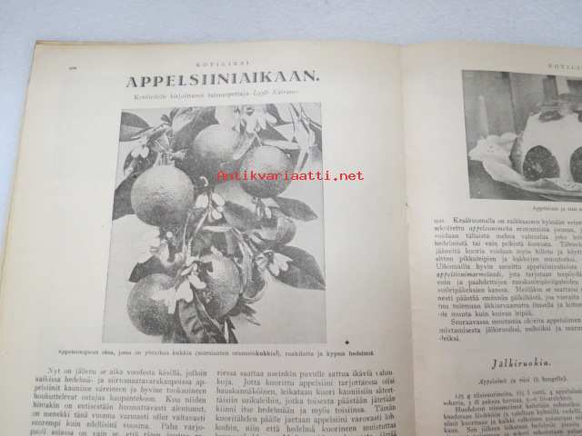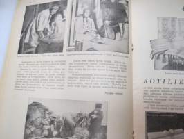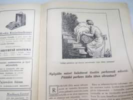 Sisältää mm. seur. artikkelit / kuvat / mainokset; Karjalan Margariini, Turun Keksitehdas, Lutherin vaimo Katharina von Bora talonemäntänä, Pohjan perukoiden koteja ja kotitöitä - Miten Lapissa leivotaan?, Joko teillä on kansallispuku?, Appelsiiniaikaan, Ford Touring, Ilona saippua, ym. 21 x 29 cm.