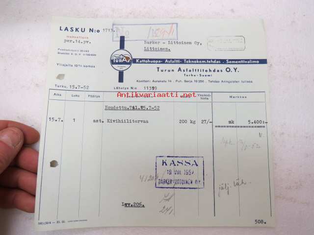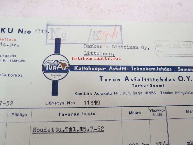 TurAs - Turun Asfalttitehdas Oy, 15.7.1952 -asiakirja / business document