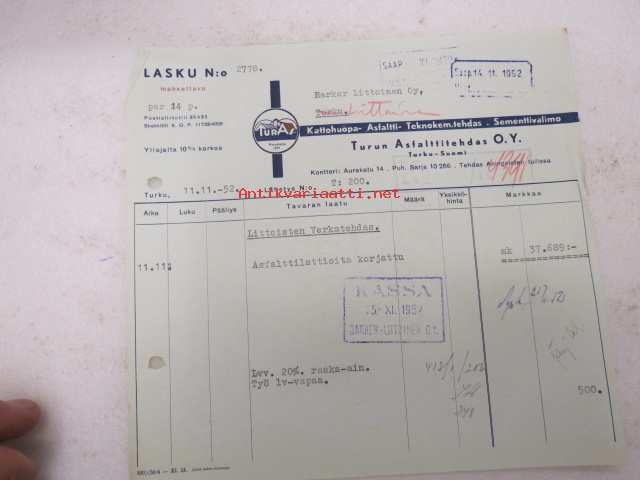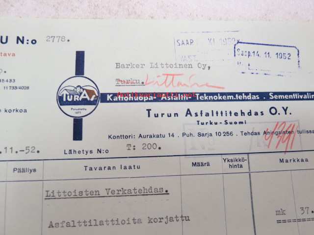 TurAs - Turun Asfalttitehdas Oy, 11.11.1952 -asiakirja / business document