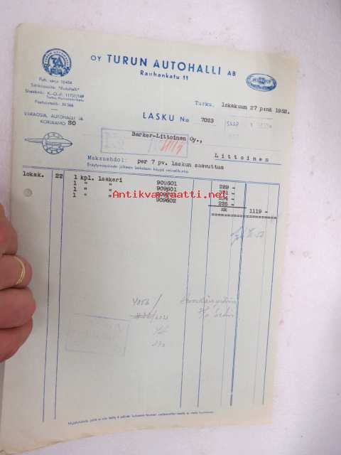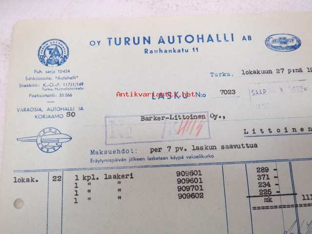 Oy Turun Autohalli Ab, Turku, 27.10.1952 -asiakirja / business document